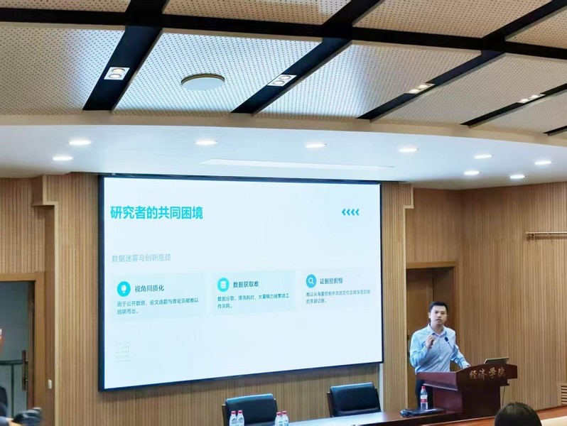 2026年4月16日下午两点半,中国研究数据服务平台高级讲师许明臻在圆楼202教室为我院师生进行题为“财经数据深度挖掘:CNRDS在科研中的应用”的培训讲座,重点介绍了CNRDS前沿数据的开发背景、具体内容及其在研究中的应用价值,帮助了师生掌握数据背后的逻辑,开拓研究视角; 讲座还介绍了“智能文本分析工具”并向在场学生赠送了账号。讲座结束后,实验室对学生的使用需求进行了调研。